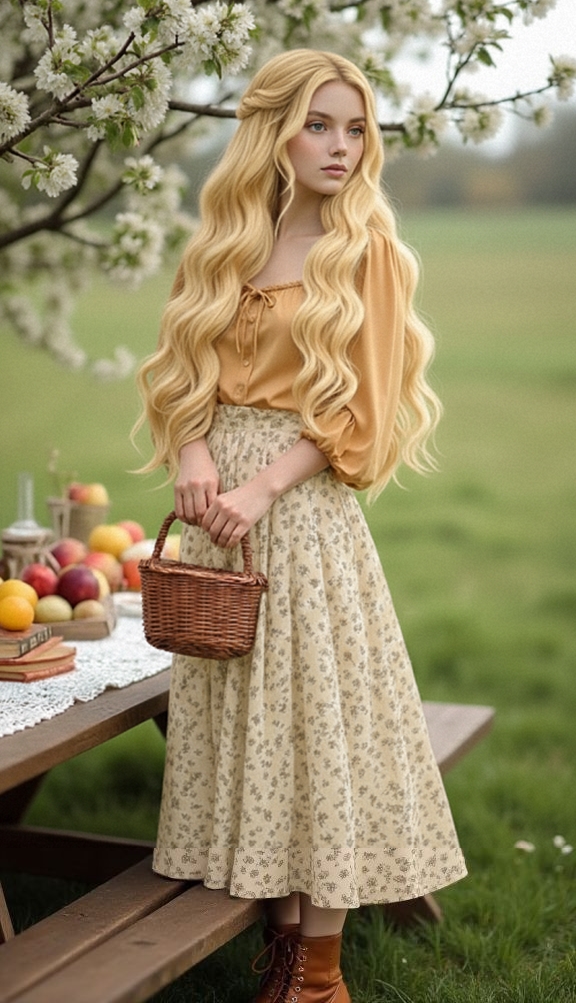 เสื้อ Puff Sleeve Top แขนยาว (เสื้อแขนตุ๊กตา) กระโปรงยาวลายดอกทรงบานเล็กน้อยเพื่อให้ดูพริ้วไหวนุ่มนวลและอ่อนโยน รองเท้าบูทหนังข้อสั้นเพื่อความคล่องตัว และมีพร็อพเป็นตะกร้าสานใบเล็ก ๆ โดยทั้งหมดเลือกใช้สีเอิร์ธโทนคุมโทนสีน้ำตาลและสีครีม